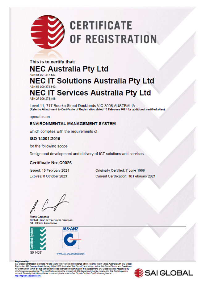 NEC Australia is committed to enhancing our environmental efficiency and we have proudly held ISO 14001 since its inception in 1996. We have established an Environmental Management Policy and implemented an Environmental Management System (EMS) based on the requirements, principles and guidelines of ISO 14001:2015 to help achieve our environmental and sustainability targets.”